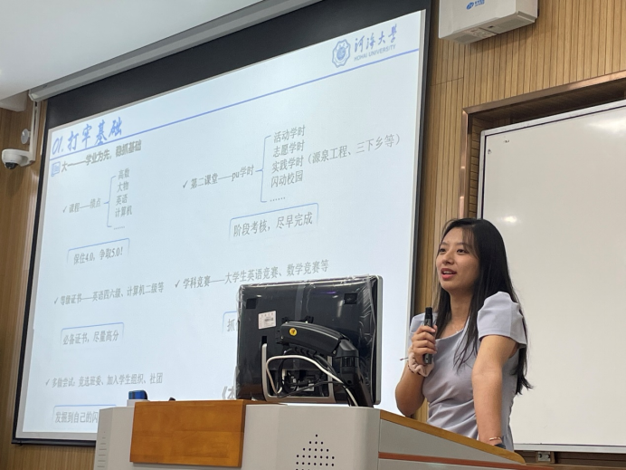 2018级给排水科学与工程专业杨诗瑶学姐向同学们展示了自己大学四年的目标与规划,提醒同学们要加强大学四年的规划。她强调大一要以学业为先,筑牢基础,勉励同学们努力学习;大二要进行创新训练,培养思维,把有限精力合理分配在个人学习、学生组织活动与社会生活之中;大三要精准定位,全面发展,她强调学好专业课是保研、考研、出国、就业的基础;最后大四要确定方向,发起冲刺,拥抱更加美好的前程。在杨诗瑶学姐的分享中,新一级环境学子展望自我未来,明确了未来的奋斗方向。