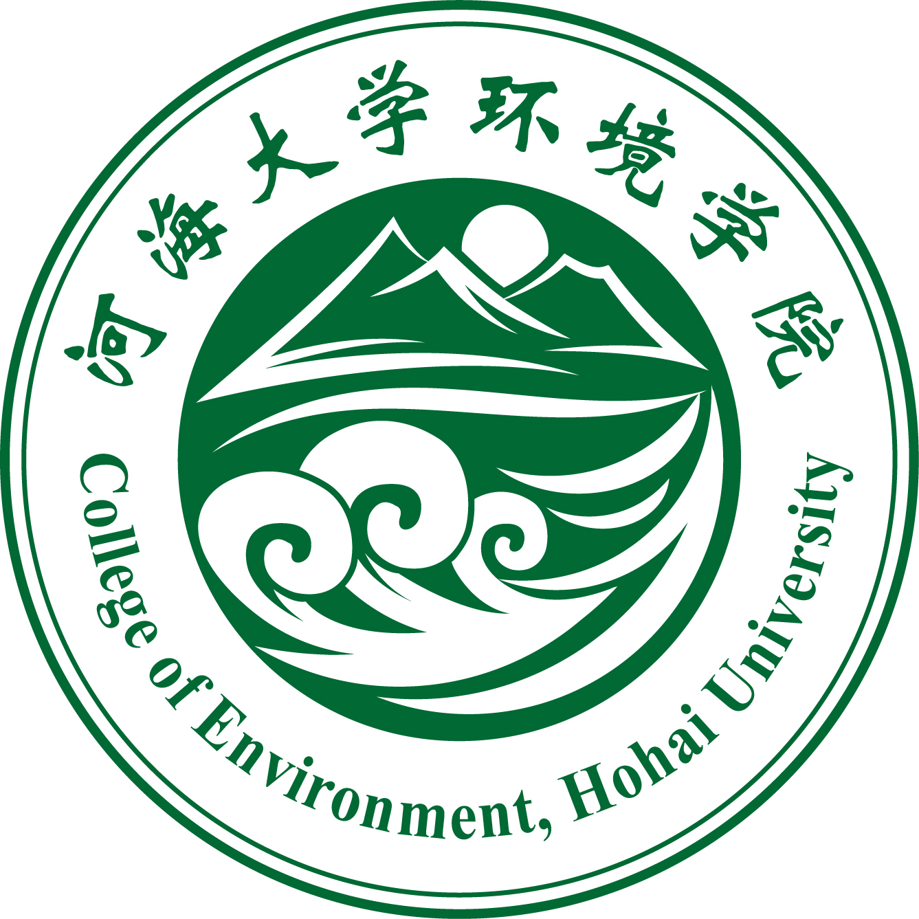 院徽外轮廓整体采用圆形,上方是学院中文名,下方是学院英文名。中间的山水和太阳表达绿水青山的生态环境,下面波浪采用体现河海特色的波浪,也代表着环境人勇立潮头、敢为人先的精神。