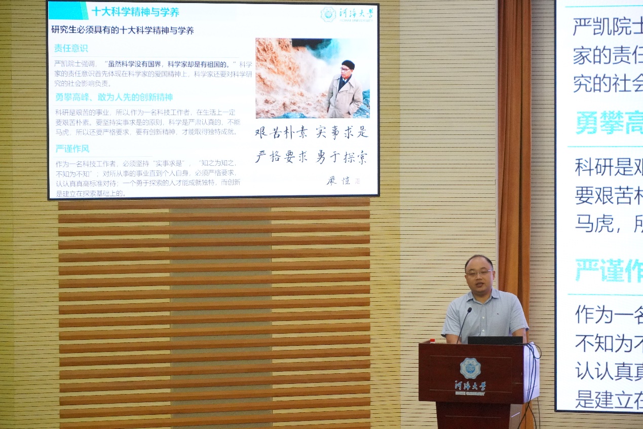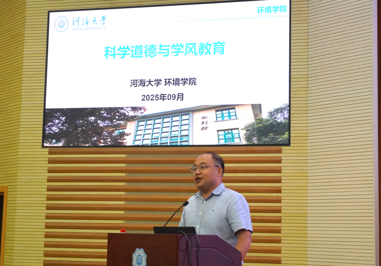 为帮助2025级研究生新生扣好学术生涯“第一粒扣子”,树立正确学术价值观、强化科研诚信与规范意识,9月9日,河海大学环境学院在闻天馆108举办题为“科学道德与学风教育”的研究生新生教育讲座。学院副院长罗景阳担任主讲人,2025级全体博士、硕士研究生新生现场参会,共同开启学术道德与学风建设的“启蒙第一课”。