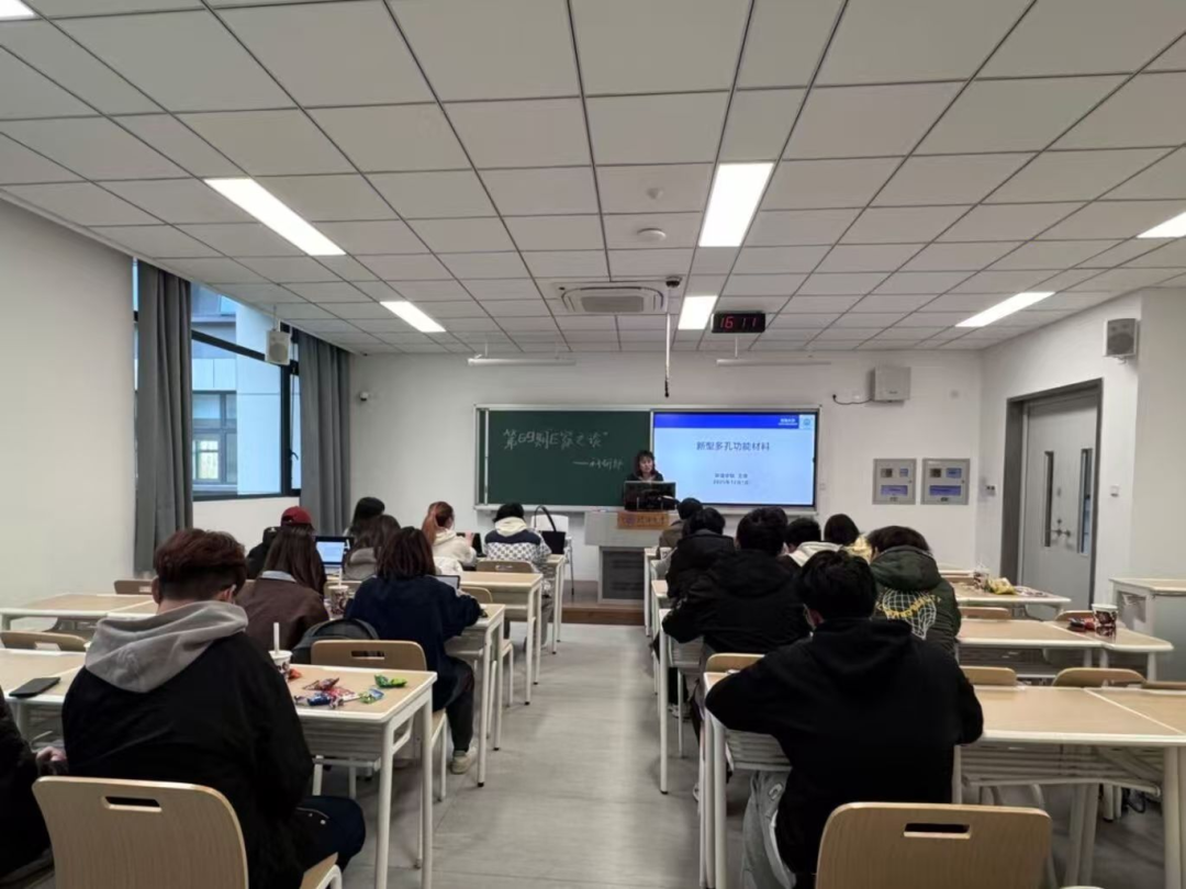 讲座伊始,王婕老师以生动通俗的语言为在场同学引入有序介孔功能材料的基本概念,从材料的结构特性、制备工艺等基础内容展开讲解。她重点分享了团队在介孔材料改性及环境修复实践中的创新成果,深入剖析了材料在实际应用中面临的挑战与优化方向,让在场师生对该领域的研究现状与发展前景有了清晰的认识。讲座尾声,王婕老师还对同学们在金坛校区的学习生活给予悉心指导。现场同学们敞开心扉,与老师密切交流,进一步明确了期末复习的方向,为即将到来的期末周做好准备。